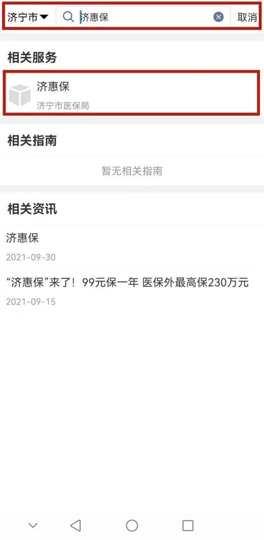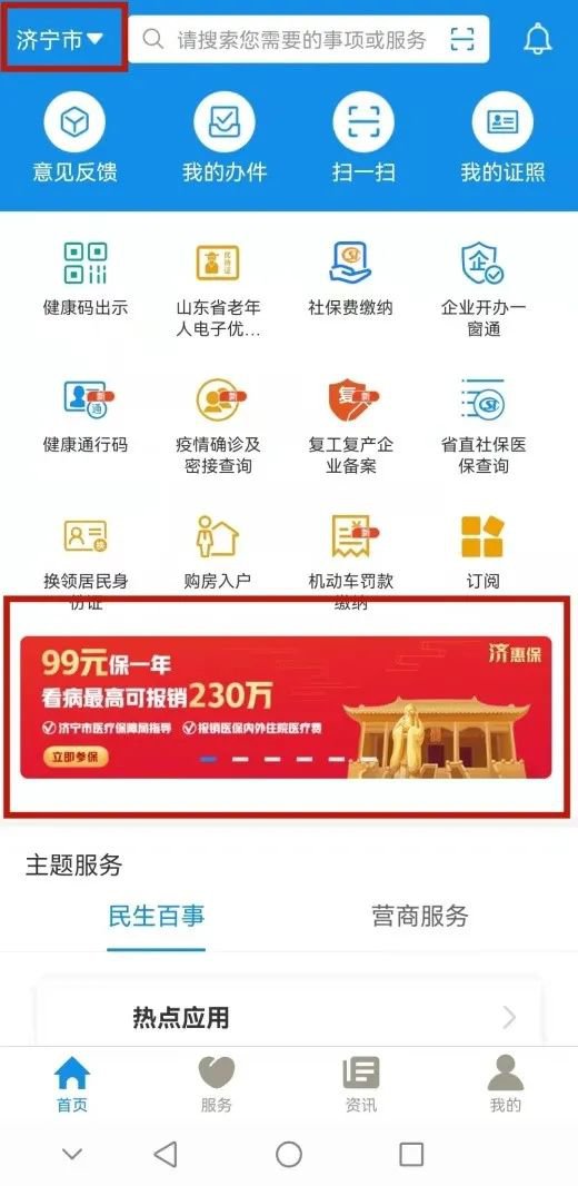 02进入“爱山东”APP济宁分厅,点击中间“济惠宝”banner图或在搜索框输入“济惠宝”,点击进入参保页面。