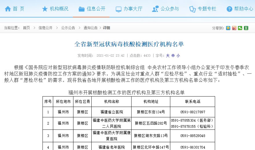 福建省卫健委公布了最新的核酸检测医疗结构名单