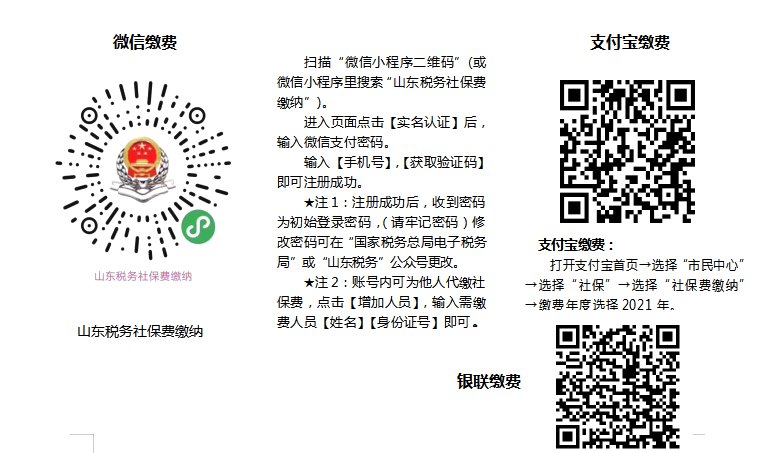 1.微信、支付宝、银联小程序缴费。微信、支付宝搜一搜“山东税务社保费缴纳”小程序或扫描二维码进入登录界面,输入手机号和验证码即可登录缴费。同时可用“增加”按钮,为其他人员缴费。