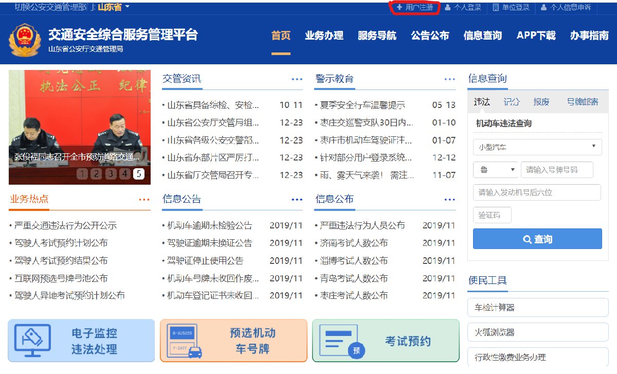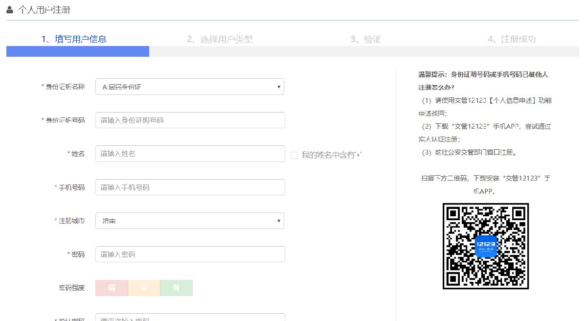 登录【交通安全综合服务管理平台】,点击【注册】,在“个人注册”界面中,填写【1、填写信息】【选择类型】【验证】【注册成功】。