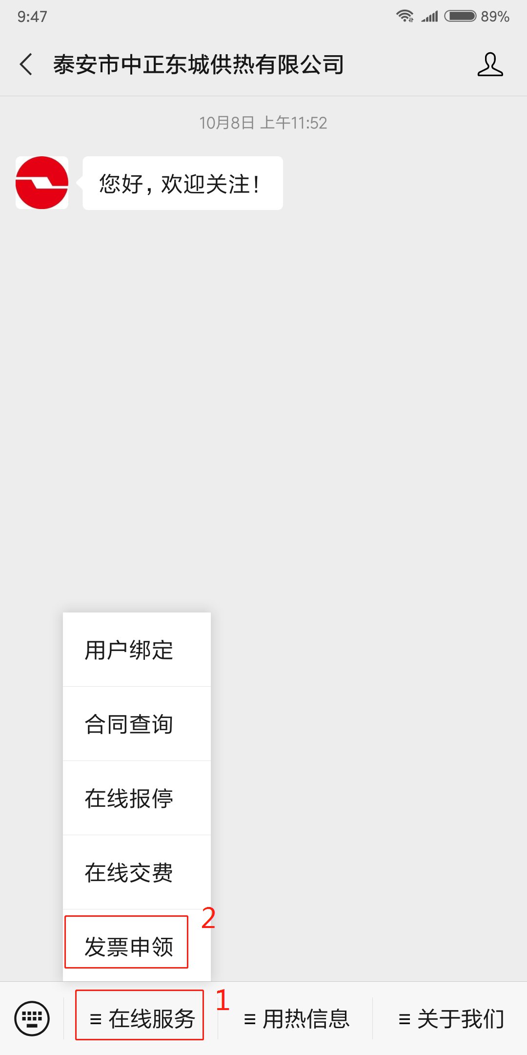 关注公众号“肥城市东城热力有限公司”,点击菜单栏“在线服务—发票申领”