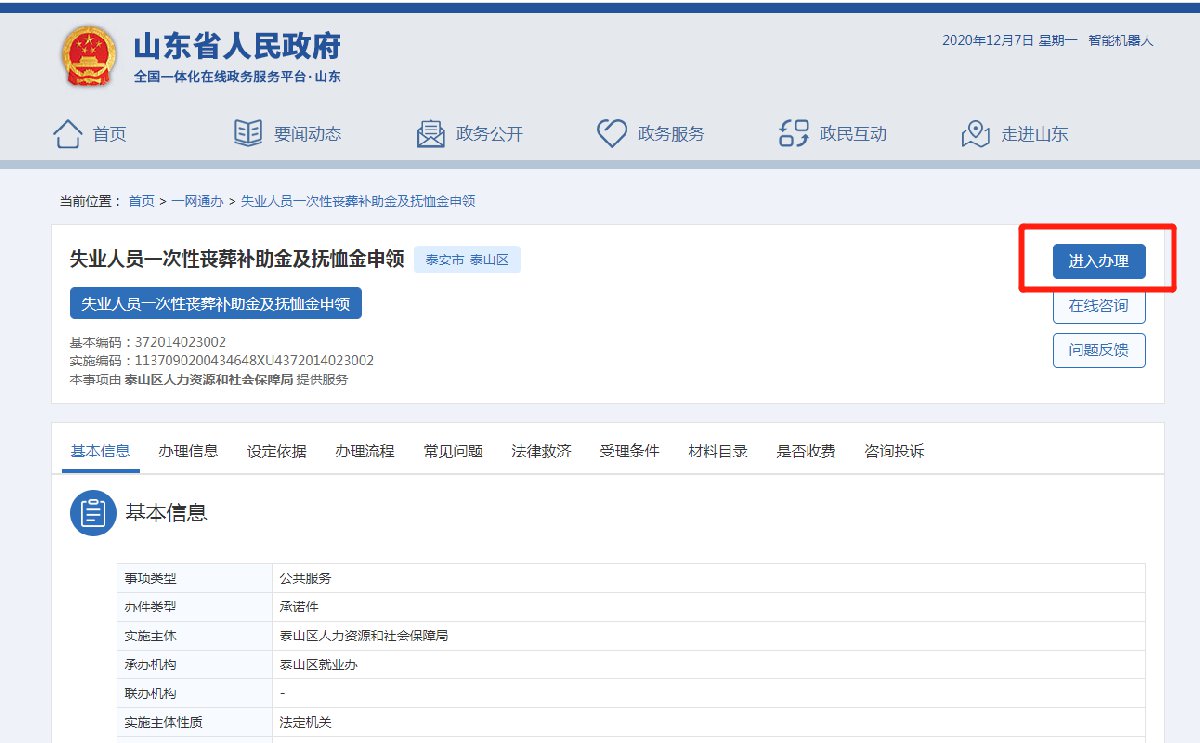 4、以失业保险丧葬补助金-泰山区为例,进入办事指南界面后,点击右上方“进入办理”,进入网上办理入口。