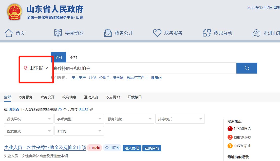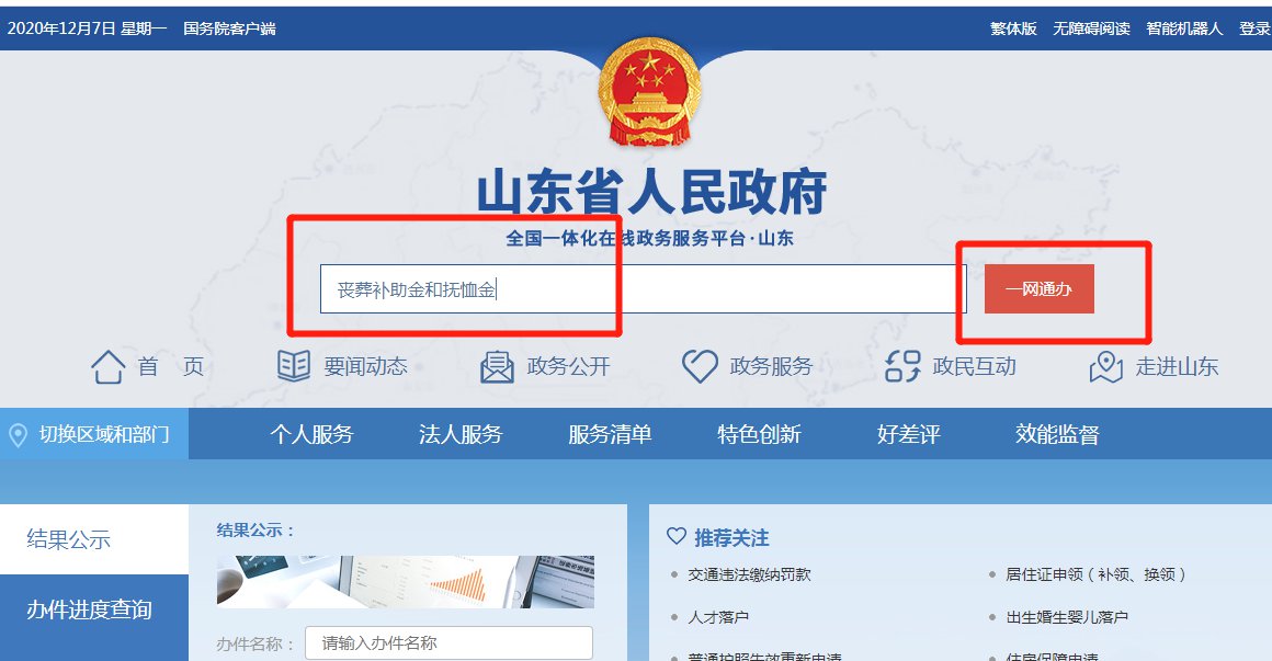 1、进入山东政务网(http://www.shandong.gov.cn/col/col94091/),搜索“丧葬补助金和抚恤金”并点击“一网通办”。