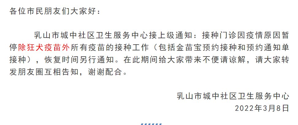 乳山市城中社区卫生服务中心接上级通知:接种门诊因疫情原因暂停除狂犬疫苗外所有疫苗的接种工作(包括金苗宝预约接种和预约通知单接种),恢复时间另行通知。在此期间给大家带来不便请谅解,请大家转发朋友圈互相告知,谢谢配合。