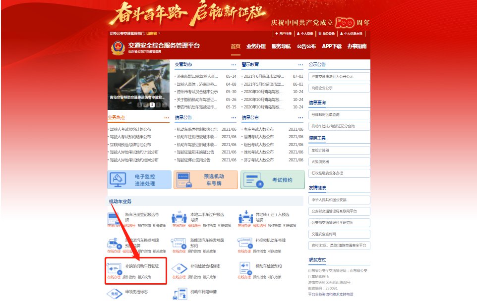 登录山东省公安厅交通管理局交通安全综合服务管理平台(https://sd.122.gov.cn/)在线补换领行驶证。