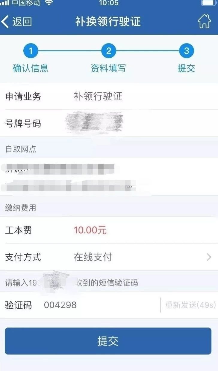 第五步:选择行驶证工本费支付方式,点击【获取验证码】按钮,系统发送短信验证码至手机,输入手机获取的短信验证码,核验通过,点击【提交】按钮,完成提交补换领号牌业务申请。