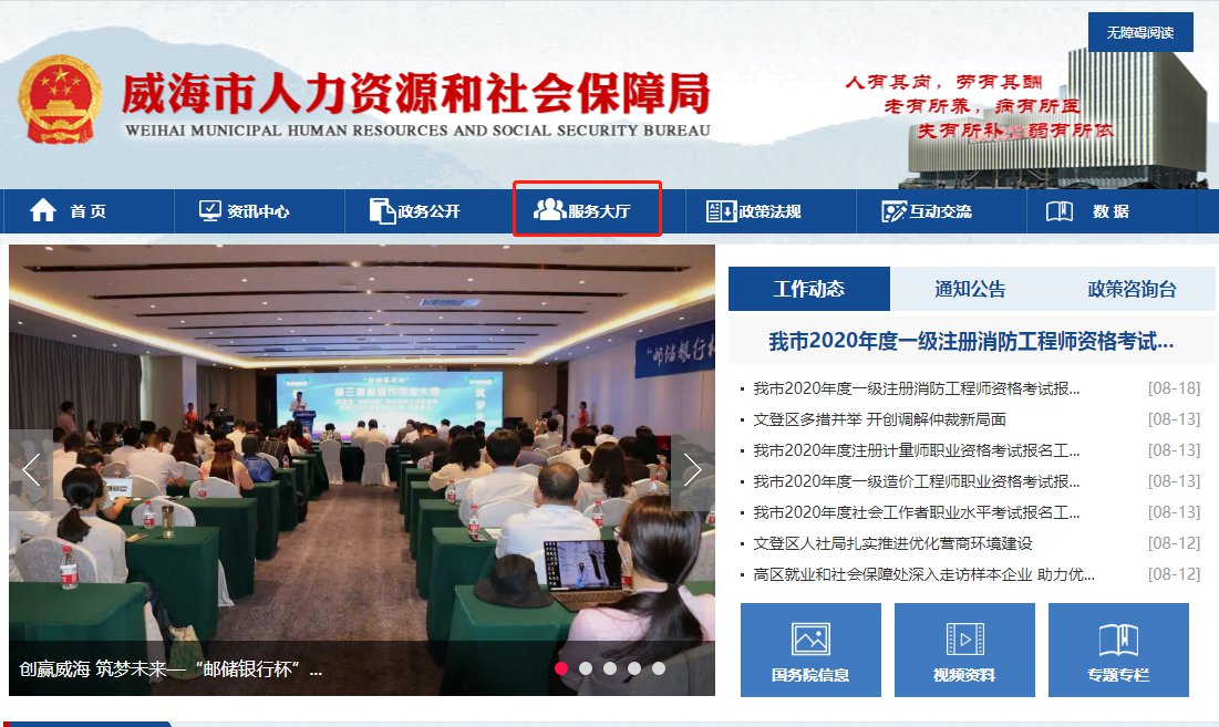 1.登录威海市人力资源和社会保障局官网(http://rsj.weihai.gov.cn/),点击“服务大厅”。