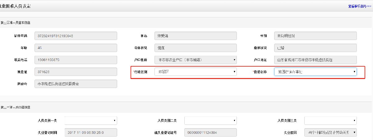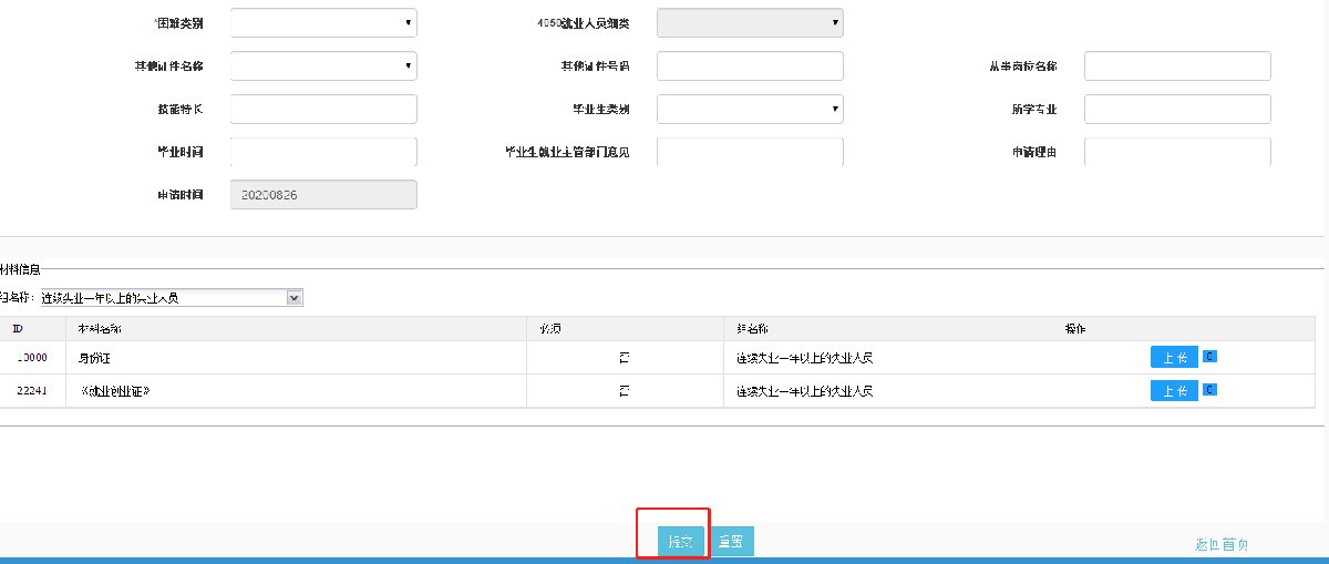 11.根据实际情况如实填报就业困难人员认定信息(只填写困难类别为“4050人员”),并选择当前的参保地行政区划为审核机构,点击“提交”,申请完成,等待参保地公共就业服务机构审核。