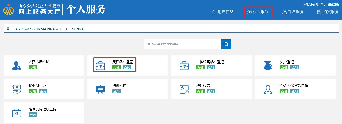 12.就业困难人员认定审核通过后,选择“公共服务”-“灵活就业登记”。