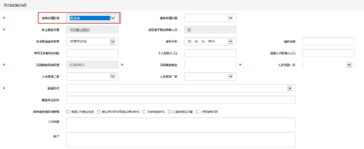 14.根据实际情况如实填报灵活就业信息(灵活就业开始日期为本年度1月1日,人员类别为“就业转失业人员”),并选择当前的参保地行政区划为审核机构,点击“提交”,申请完成,等待参保地公共就业服务机构审核。