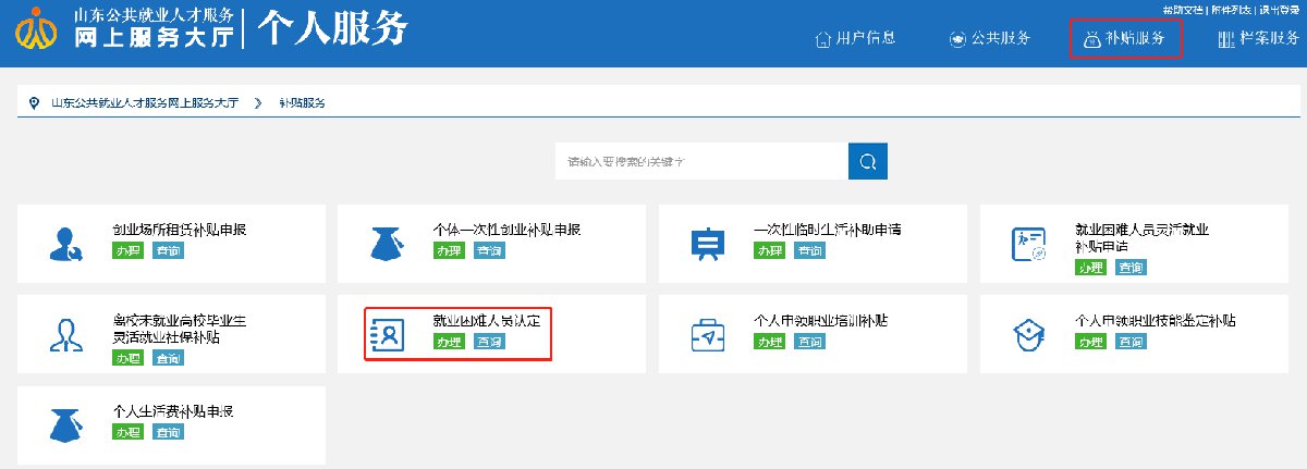 9.失业登记审核通过后,选择“补贴服务”-“就业困难人员认定”。