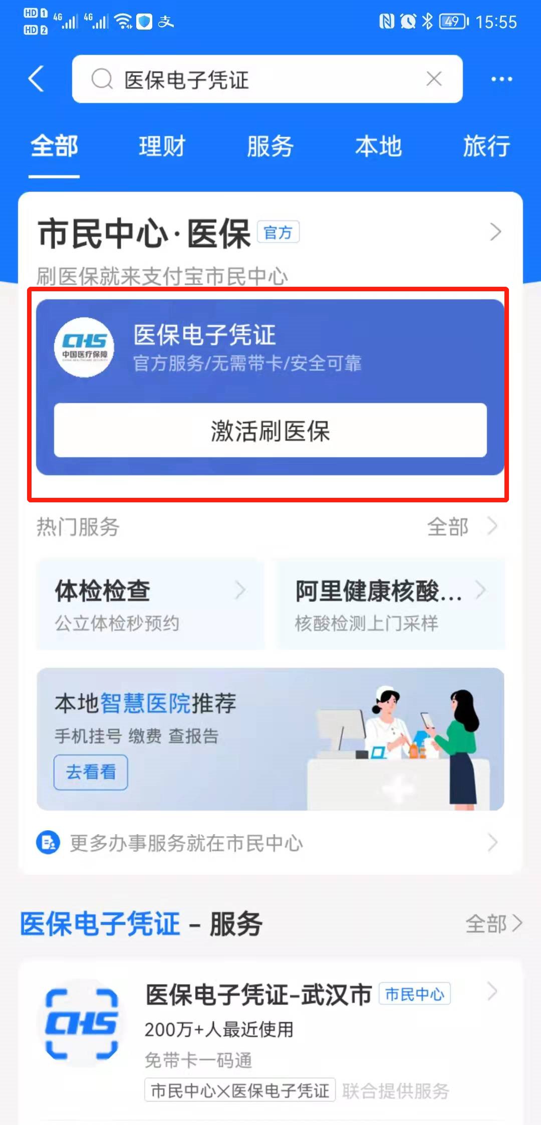 (二)支付宝开通方式:搜索“医保电子凭证”点击“激活刷医保”,进行激活领取使用。