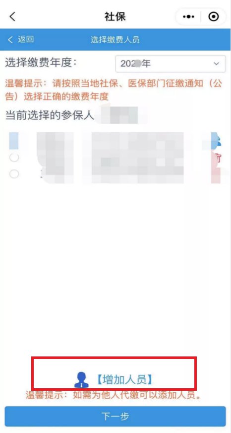 第三步:右上角选择缴费年度(2022),选择参保人(第一次需用“增加人员”添加人员信息),然后下一步;
