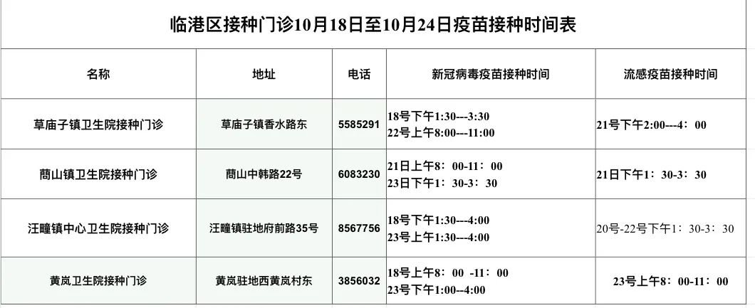 临港区10月18—24日接种新冠疫苗、流感疫苗接种时间表
