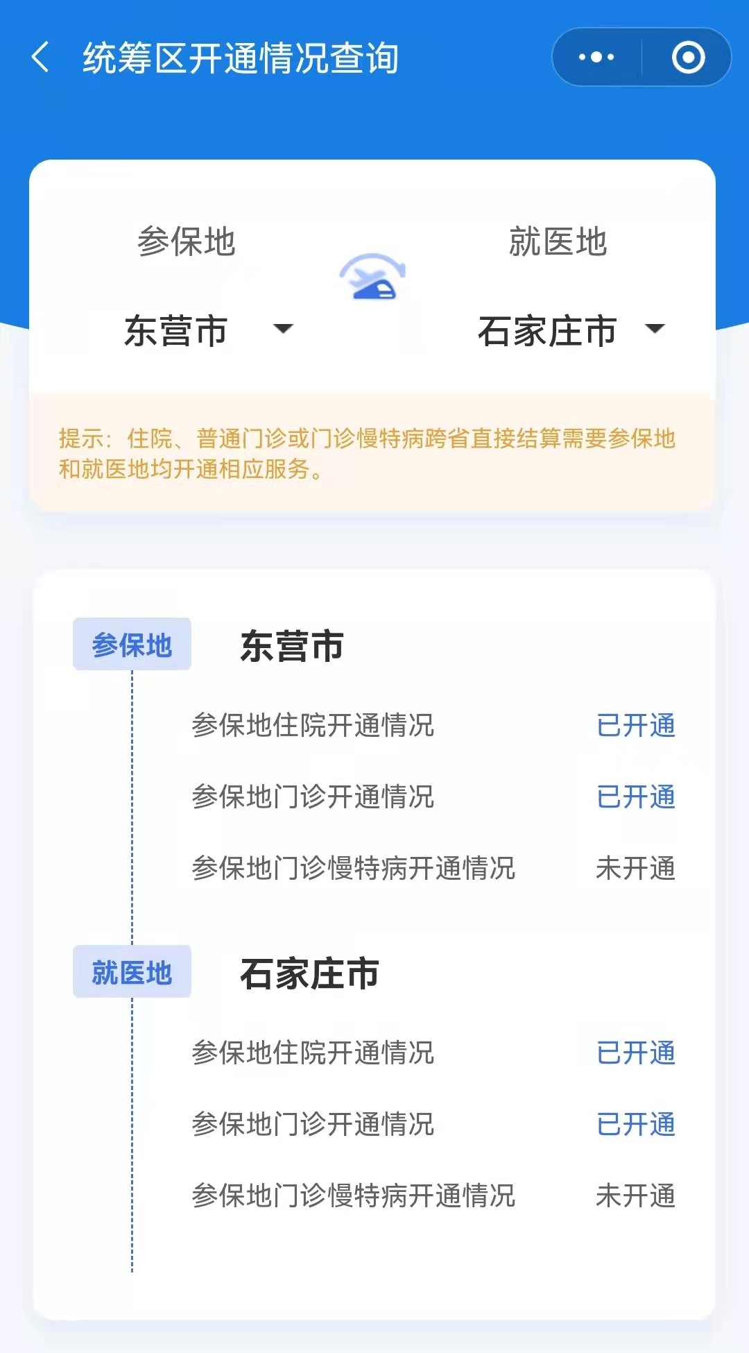 3、异地就医统筹区开通信息查询。只要在所属省份选择你需要备案的城市,即可查询当地的住院、门诊等异地就医是否开通。