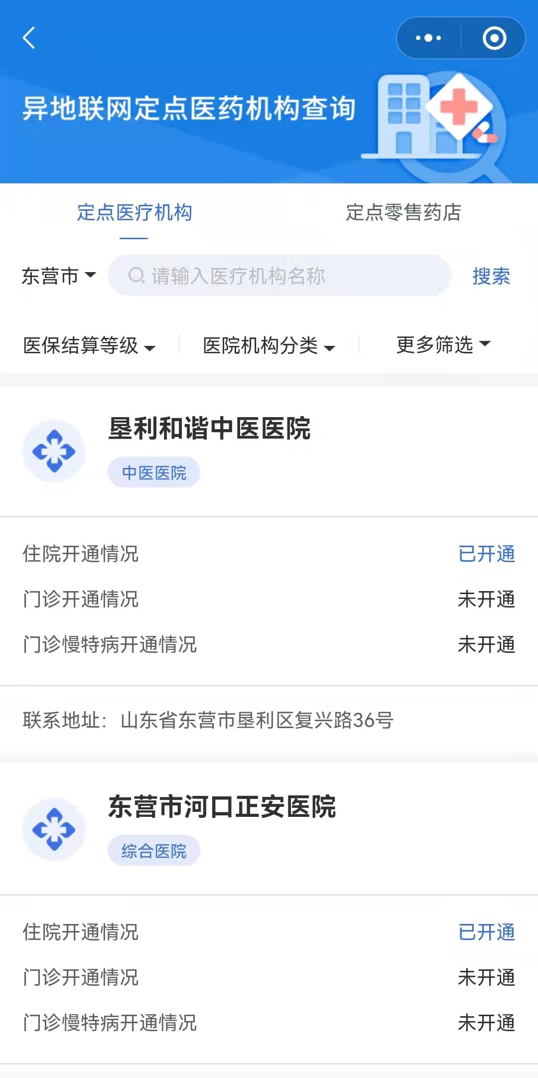 2、选择东营市城市后,通过在顶部输入框中直接输入医疗机构名称进行筛选,或根据医院等级和医院机构分类筛选。