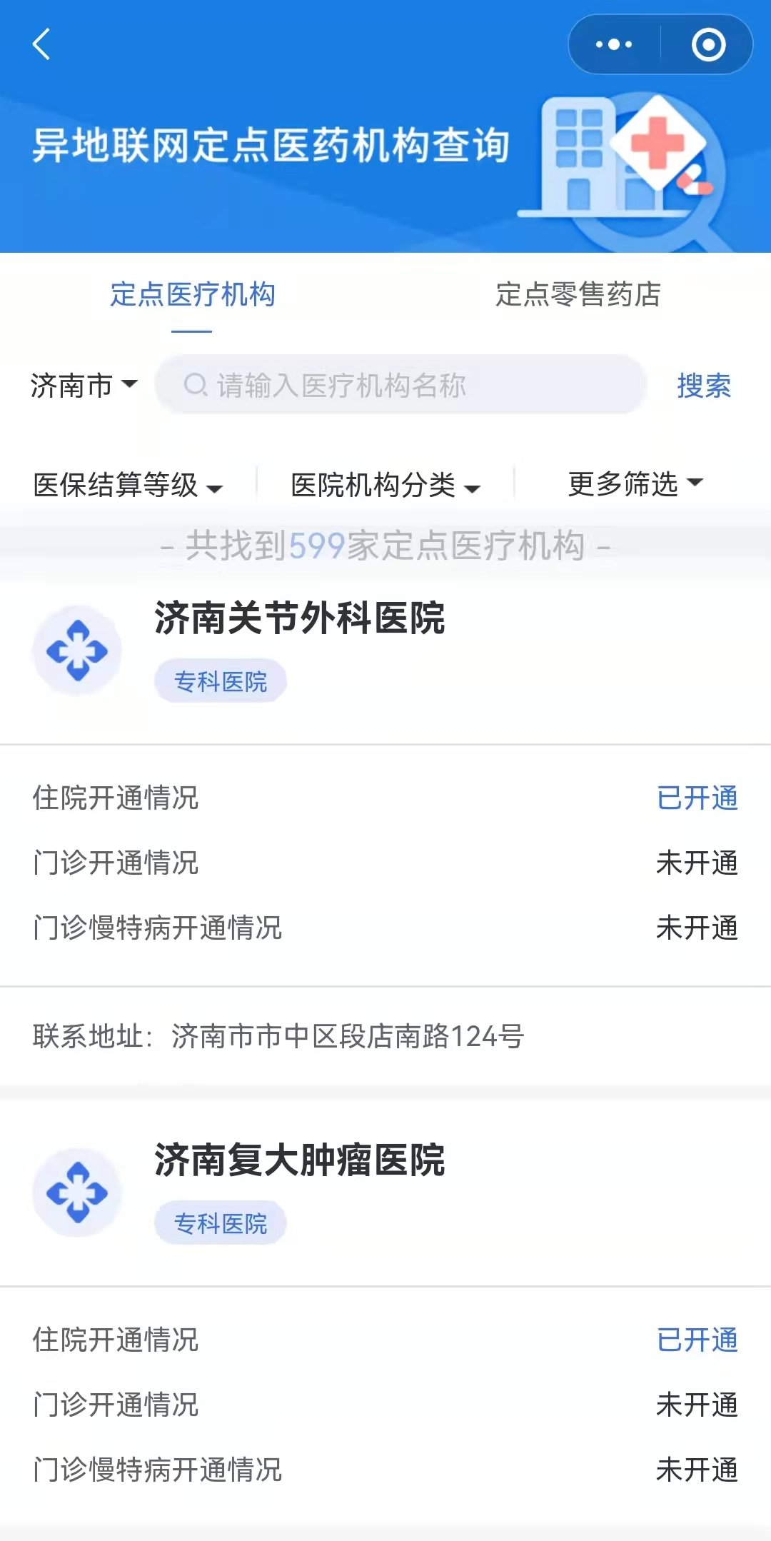 2、选择城市后,通过在顶部输入框中直接输入医疗机构名称进行筛选,或根据医院等级和医院机构分类筛选。