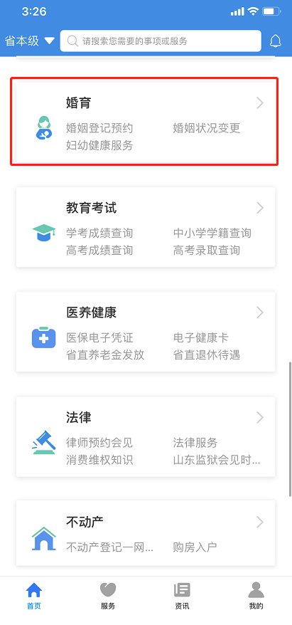1、在“爱山东”APP首页“主题服务”中找到“婚育”板块,点击“婚姻登记预约”。