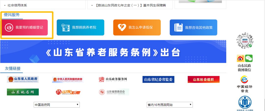 1、登录山东省民政厅官网,预约网址为:http://103.239.154.243:8090/marry/