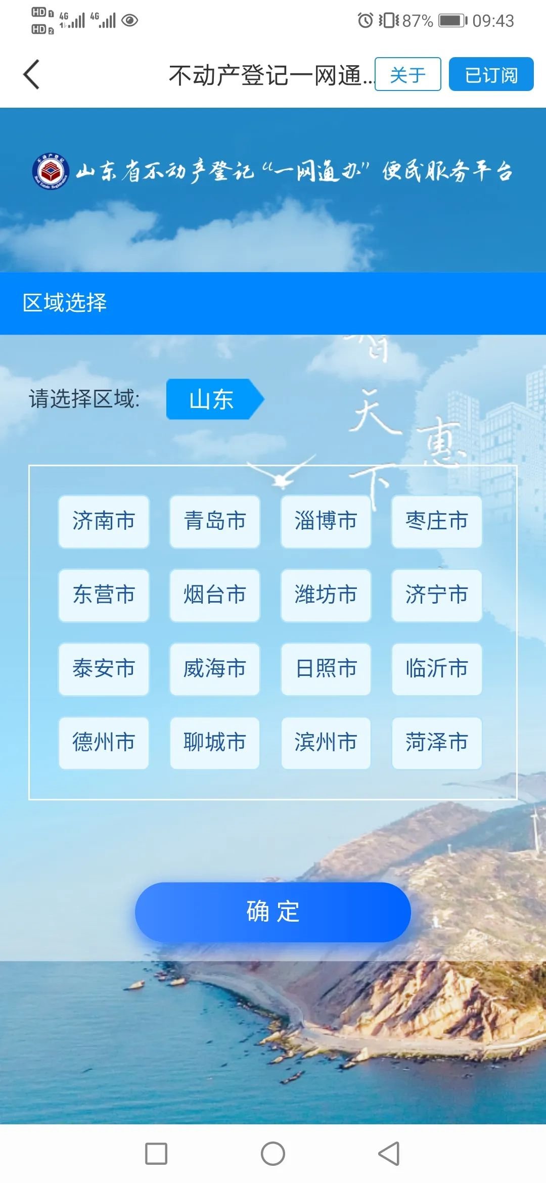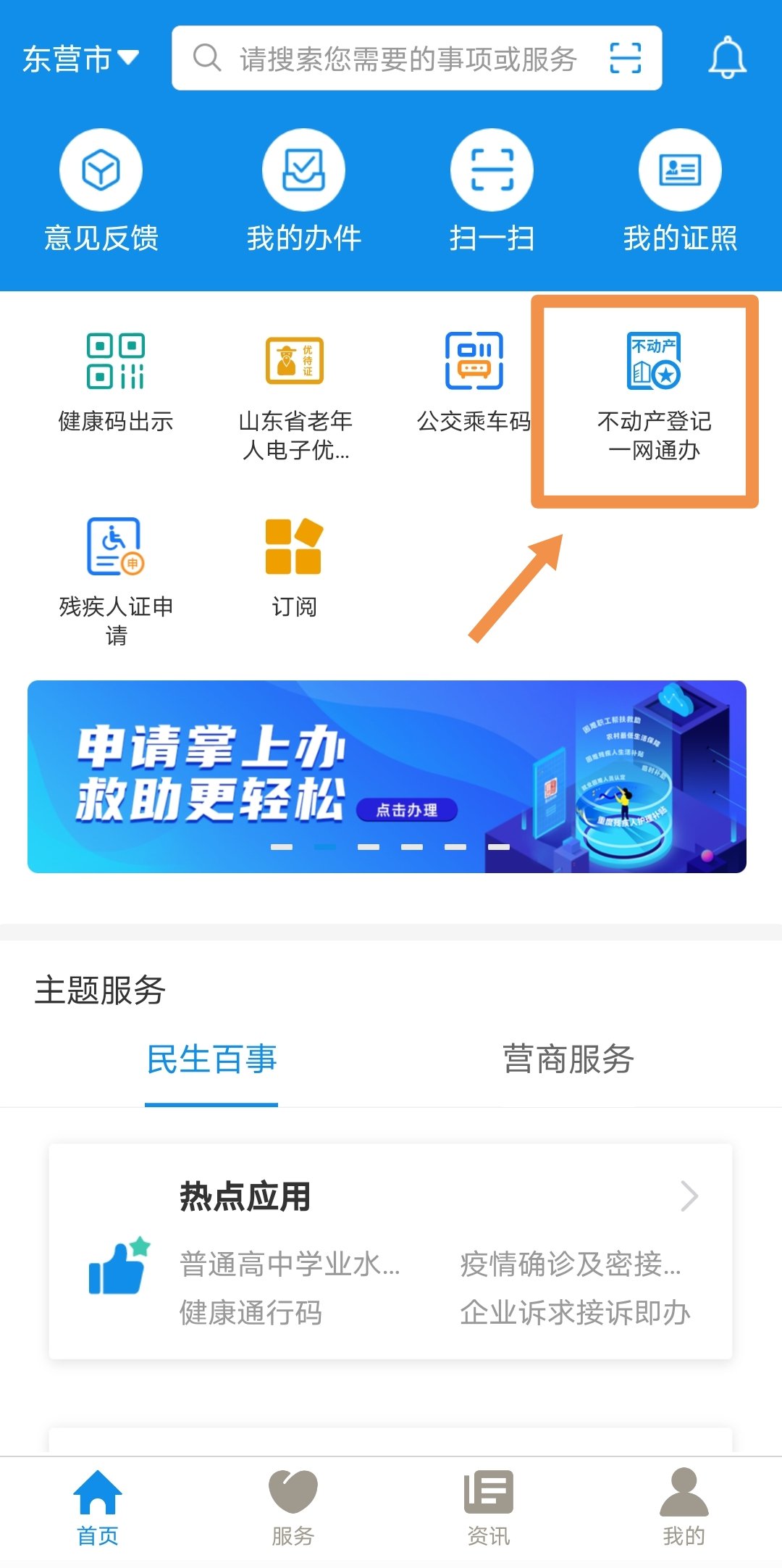 下载“爱山东”APP,点击“不动产登记一网通办”(首次登录需要“支付宝”认证),选择山东---东营。