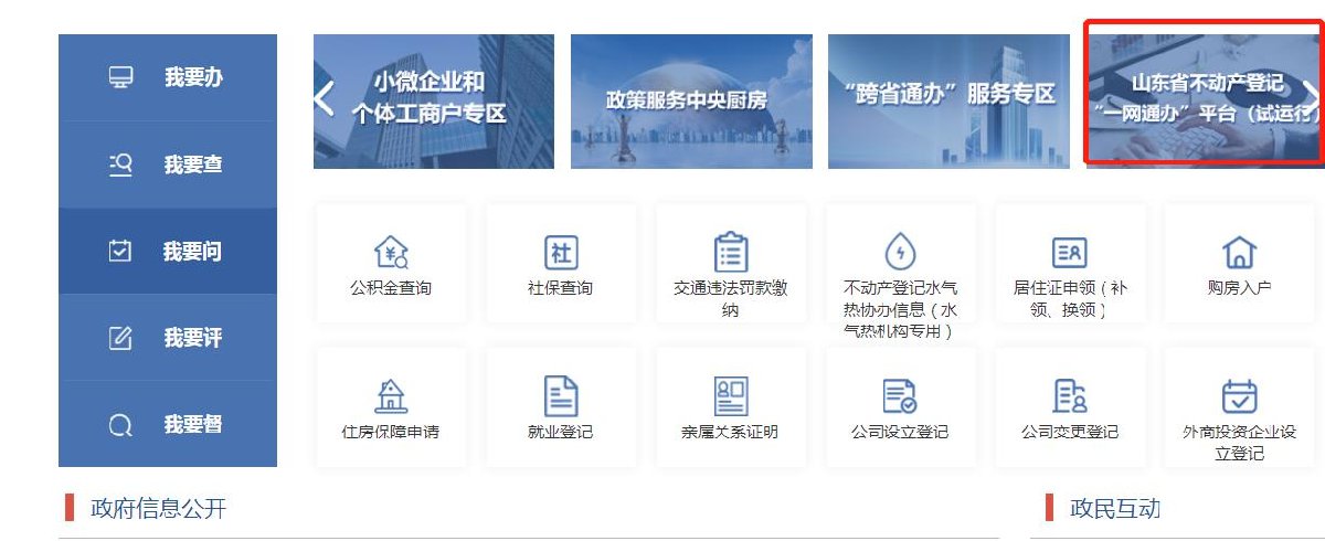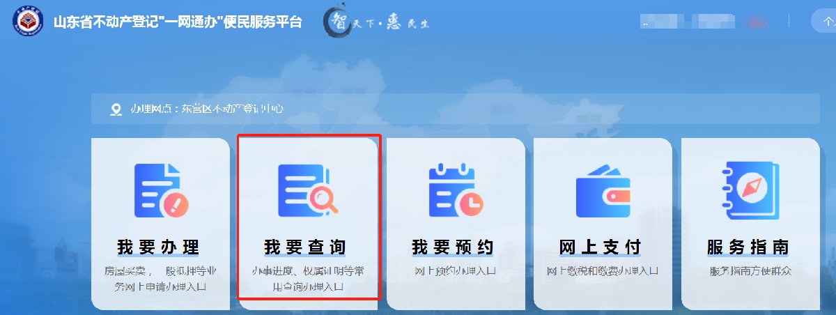 登录山东省政务服务网(点击查看),点击进入山东省不动产登记(点击登录)“一网通办”平台,选择山东----东营。最后点击“我要查询”