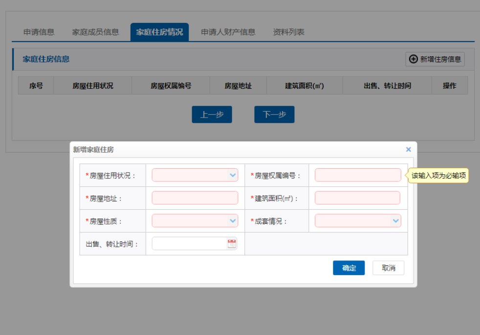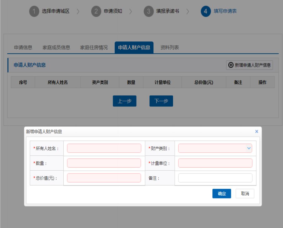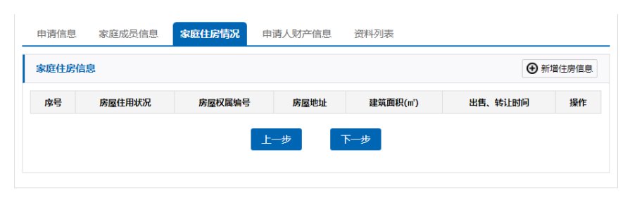 (7)添加家庭住房情况、财产信息(方法同添加家庭成员信息)。 注意:申请人家庭成员名下的财产信息也要如实填报, 特别是房产、汽车等有形资产,切勿瞒报漏报。如果存在弄虚作假、骗取保障资格行为,五年内不再受理保障申请