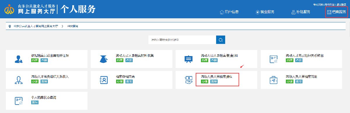 3、选择“档案服务”,点击“流动人员人事档案接收”。
