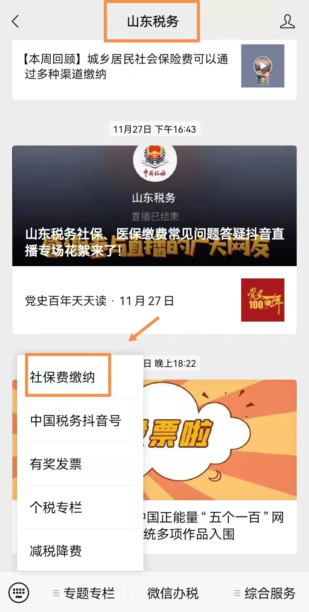 1、关注“山东税务”微信公众号或者登录“山东税务社保费缴纳”微信小程序办理缴费。