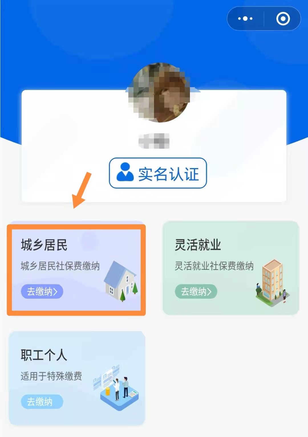 ②实名认证,输入自己的姓名、身份证号、手机号。认证后点击“城乡居民”就可进行缴费