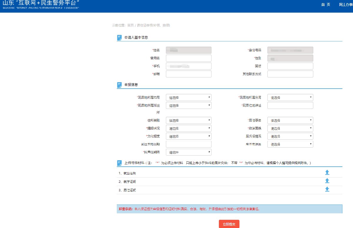 >>点击进入“山东互联网+民生警务平台”,点击居住证申领(补领、换领)办理界面,仔细阅读办理指南后,点击正下方“申报”。