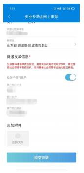 6.填写申请人手机号码,核对参保地(如参保地为山东省聊城市市本级的,请选择最后一次失业保险参保所在地),核对社保卡银行账户信息,点击“提交申请”按钮,完成申请。