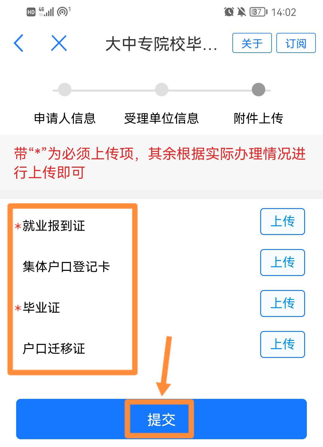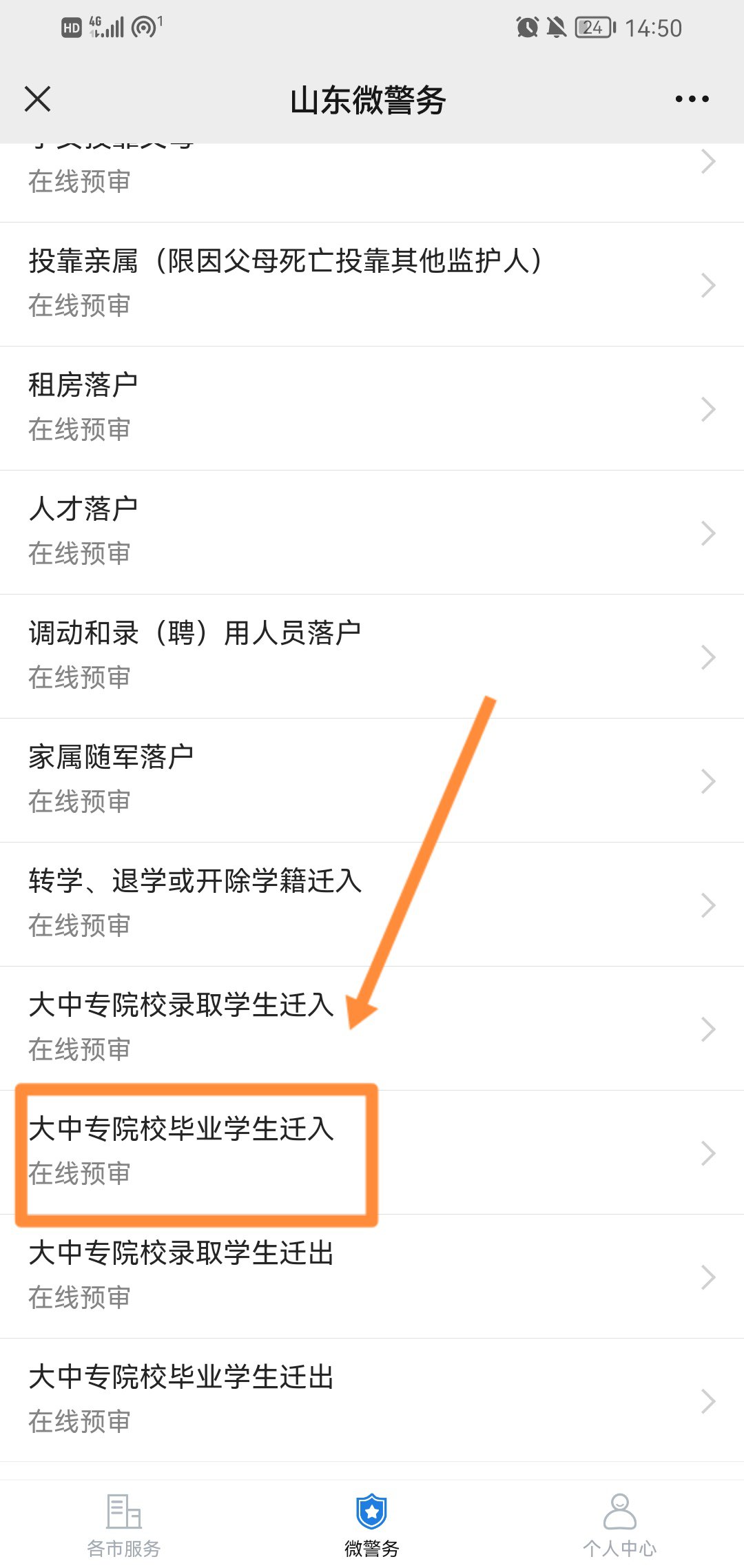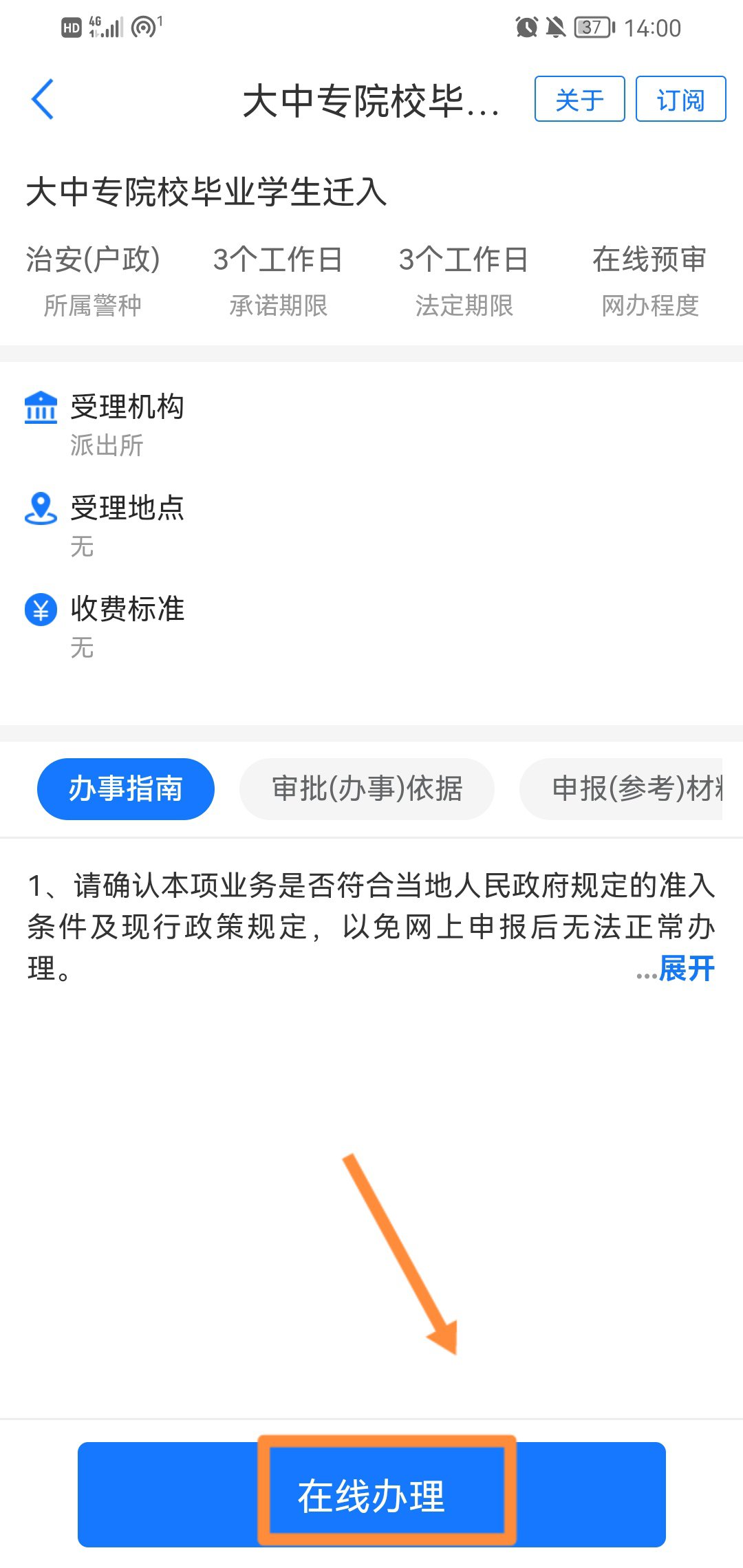 3、点击【大中专院校毕业学生迁入】,进入页面,点击【在线办理】