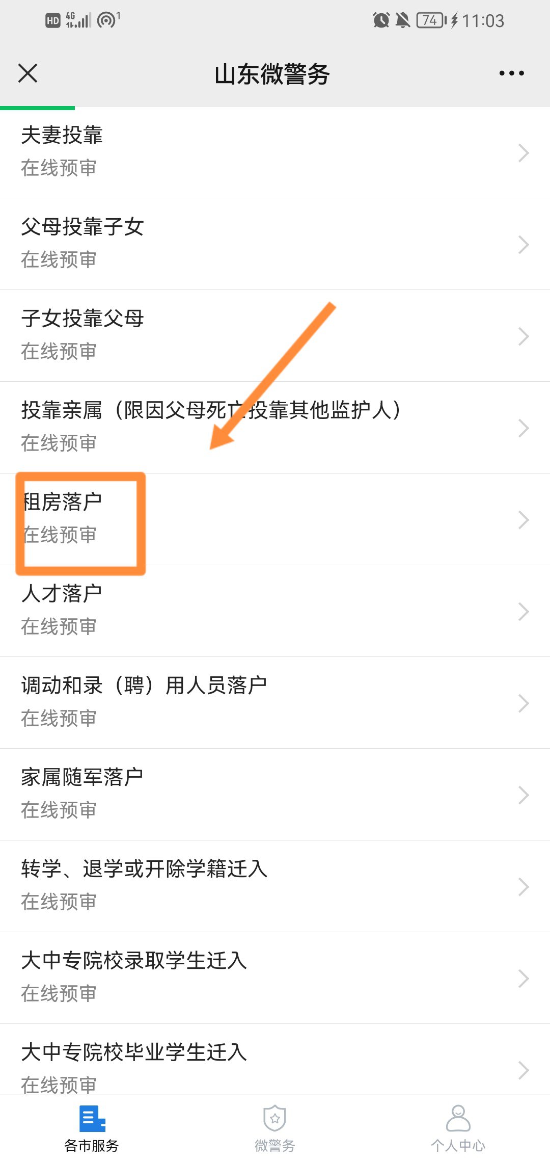 4、进入页面,选择办理业务【租房落户】