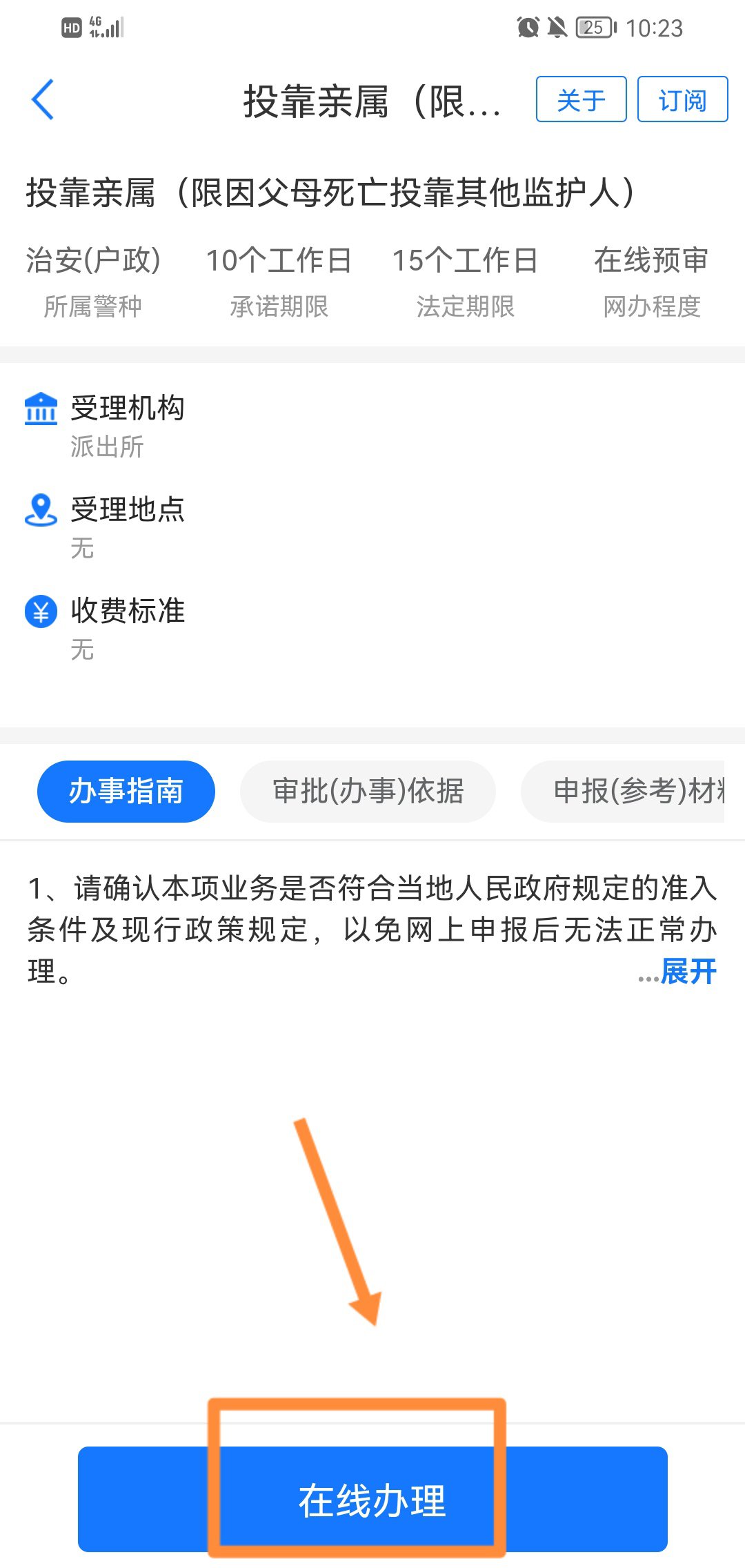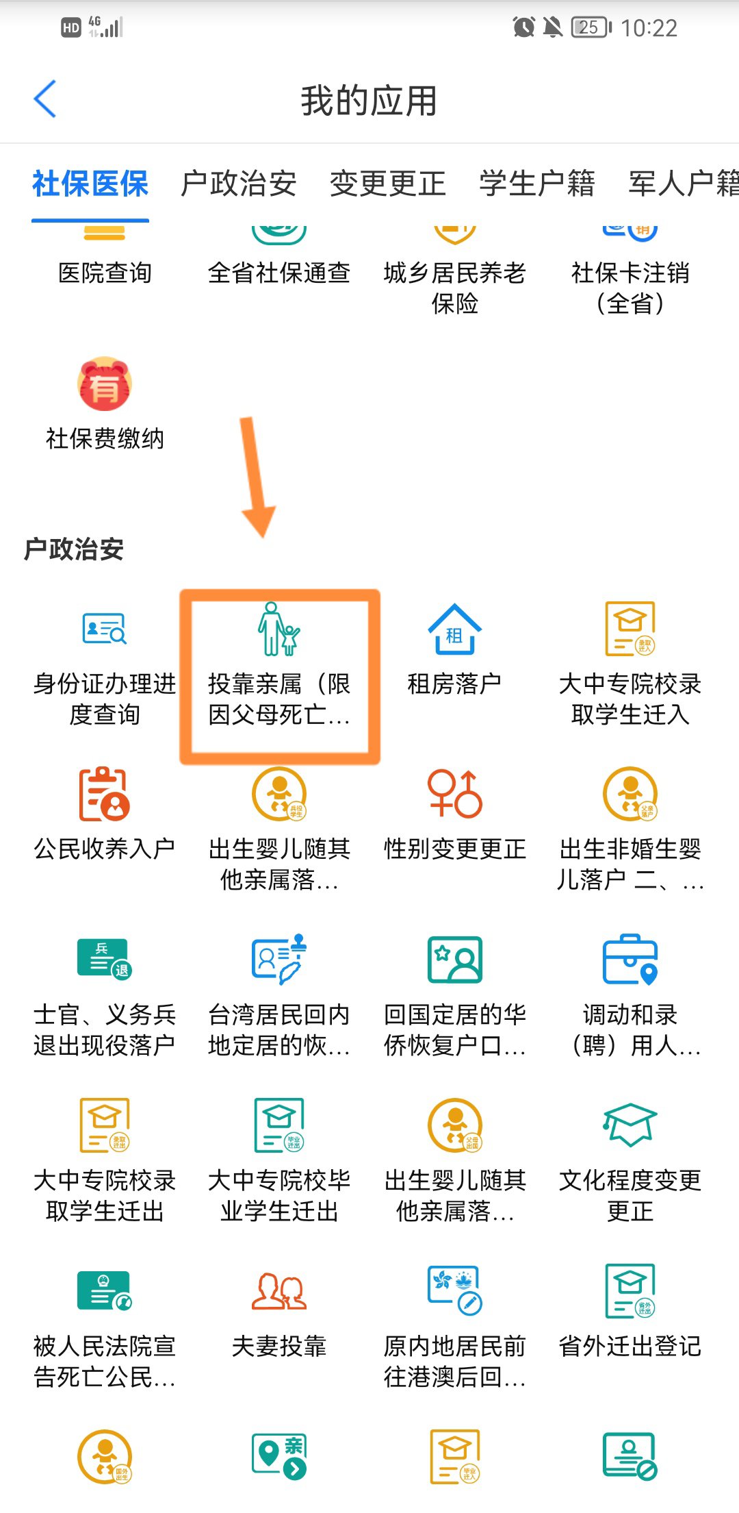 3、以夫妻投靠落户为例,点击【投靠亲属】,进入页面,点击【在线办理】