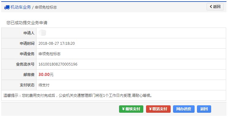 如果平台支持在线缴纳邮费且选择在线缴费,提交完成后显示如下: