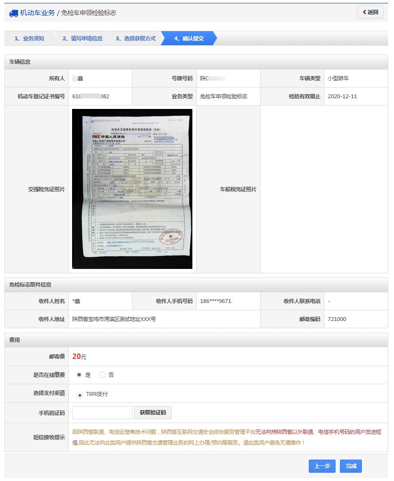 该步骤显示用户的车辆信息、领取详情以及需要缴纳费用信息,如果平台已开通在线支付功能,显示在线支付详情。