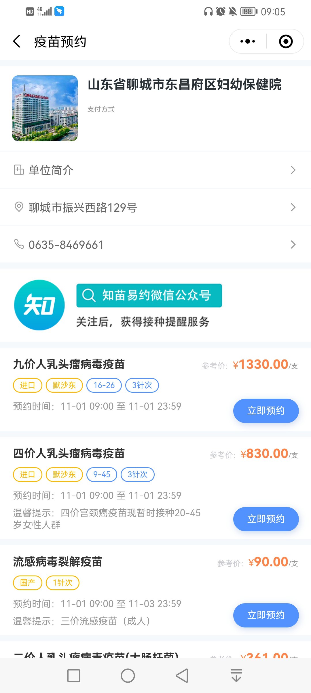 聊城市东昌府区妇幼保健院九价hpv疫苗、四价hpv疫苗及二价hpv疫苗有苗啦!有意愿的小伙伴在知苗易约小程序上进行预约,预约时间为11月1日9:00开始,预约完为止,预约成功后三天内必须来接种,过期作废。
