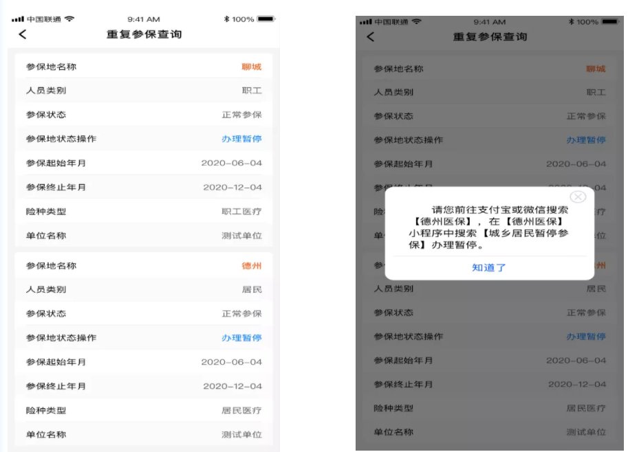 (二)如果人员类别是“居民”,点击“参保地状态操作”【办理暂停】,温馨提示:“请您前往支付宝或微信搜索户籍地所在地市医保小程序(比如您的户籍地是德州,支付宝或微信搜索【德州医保】),在小程序中,搜索【城乡居民暂停参保】办理暂停。”