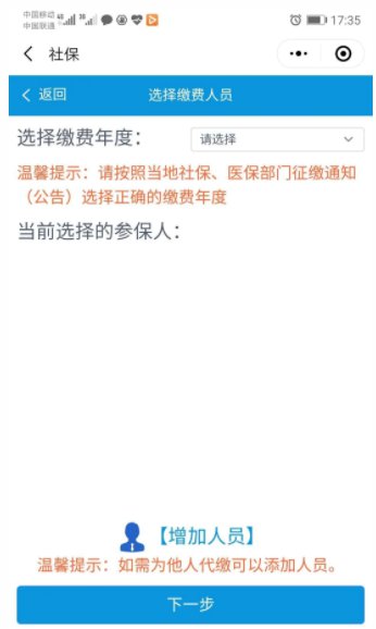(二)增加人员。点击城乡居民模块,点击居民医疗,选择下方增加人员,输入需要缴费的人员姓名及身份证号,点击确认后选择下一步。