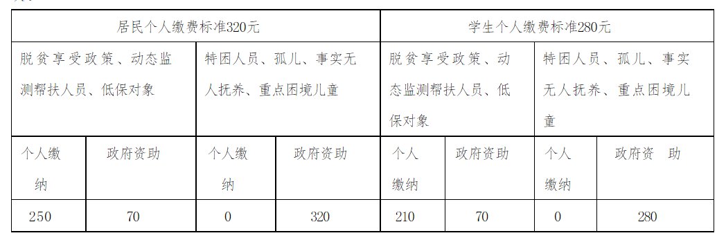 缴费标准:2022年度我县城乡居民基本医疗保险个人缴费标准为每人320元,在校学生为每人280元;政府资助人员缴费:根据今年困难群体的缴费政策,政府资助人员以2021年9月底政府资助名单为准,资助范围:扶贫部门确定的脱贫享受政策人员、动态监测帮扶(即时帮扶)人员;民政部门确定的低保对象、特困人员、孤儿、事实无人抚养儿童和重点困境儿童。按资助类别确定资助金额和缴费档次。