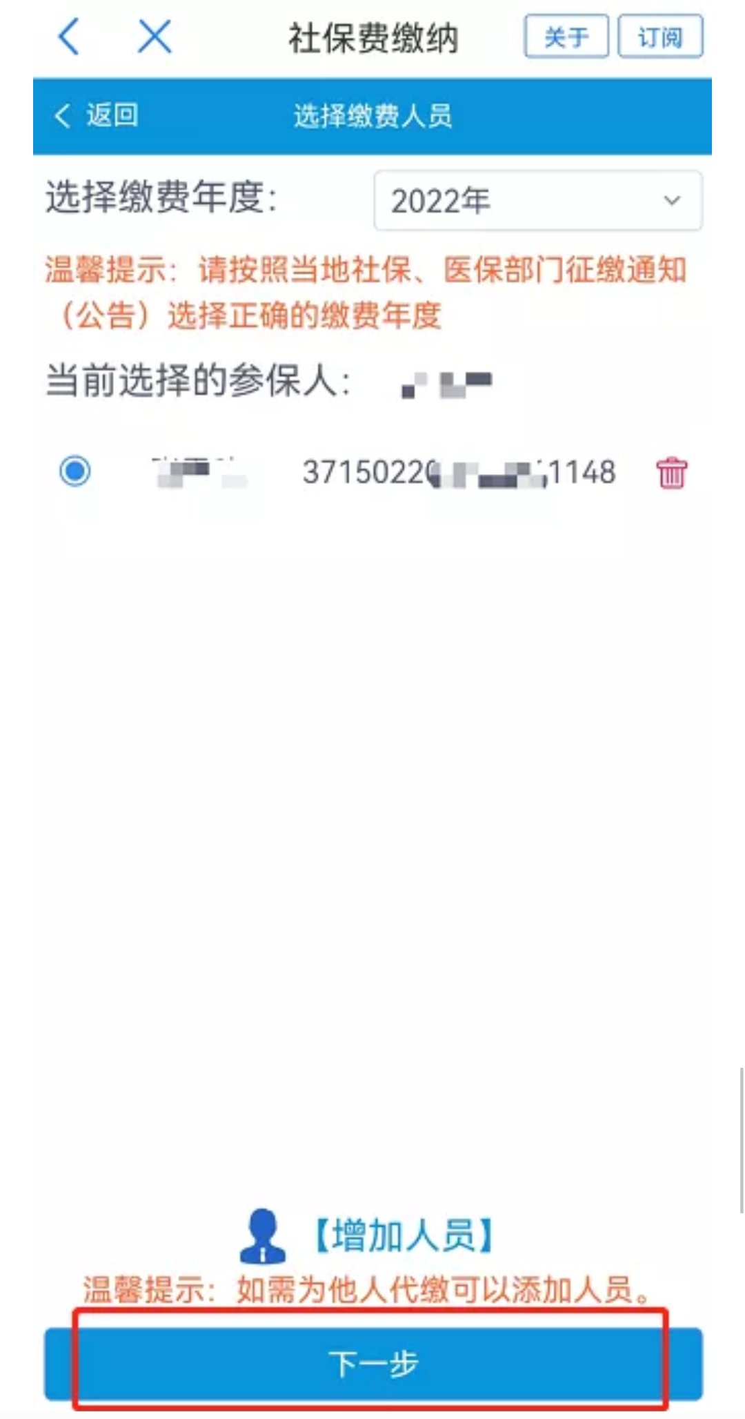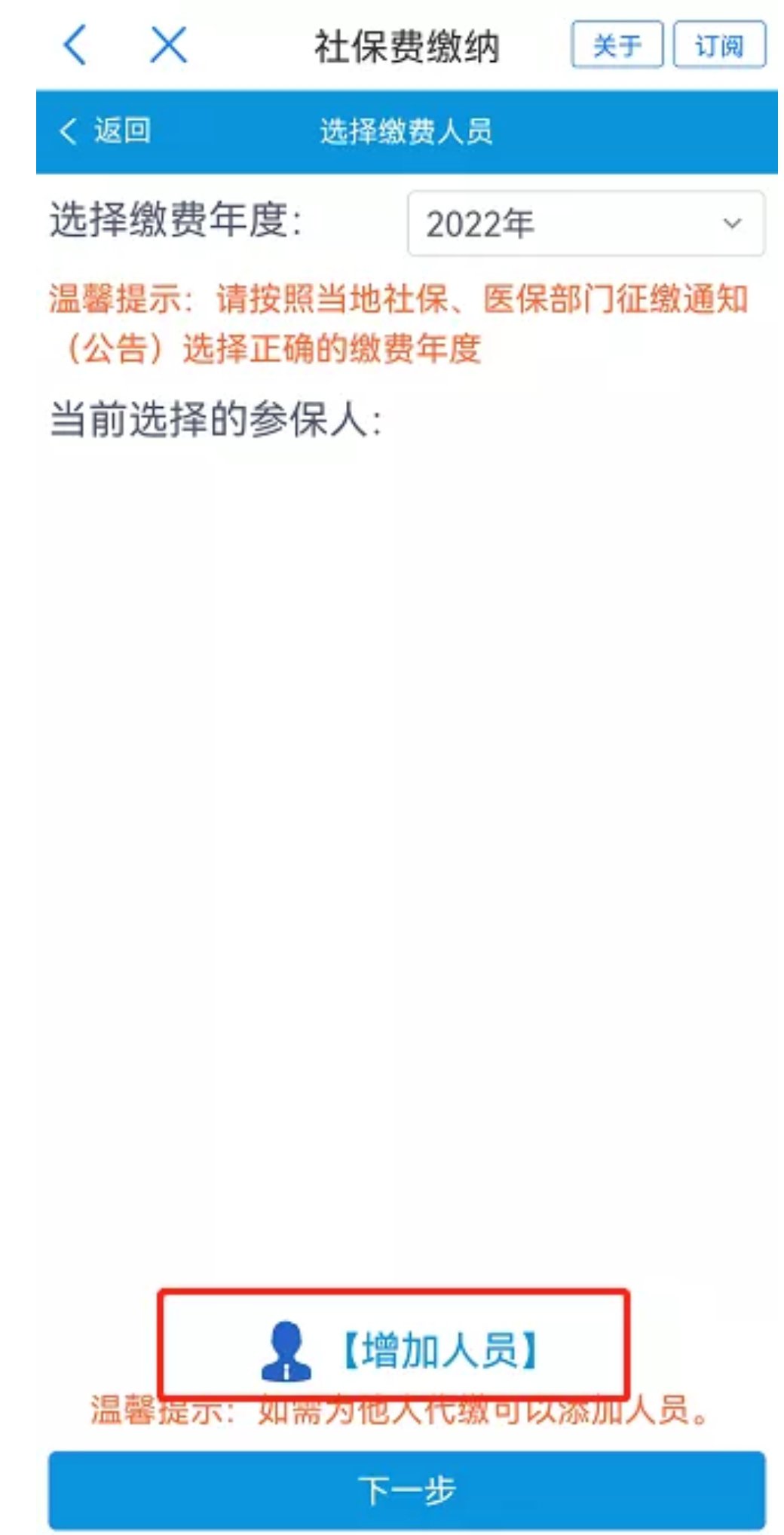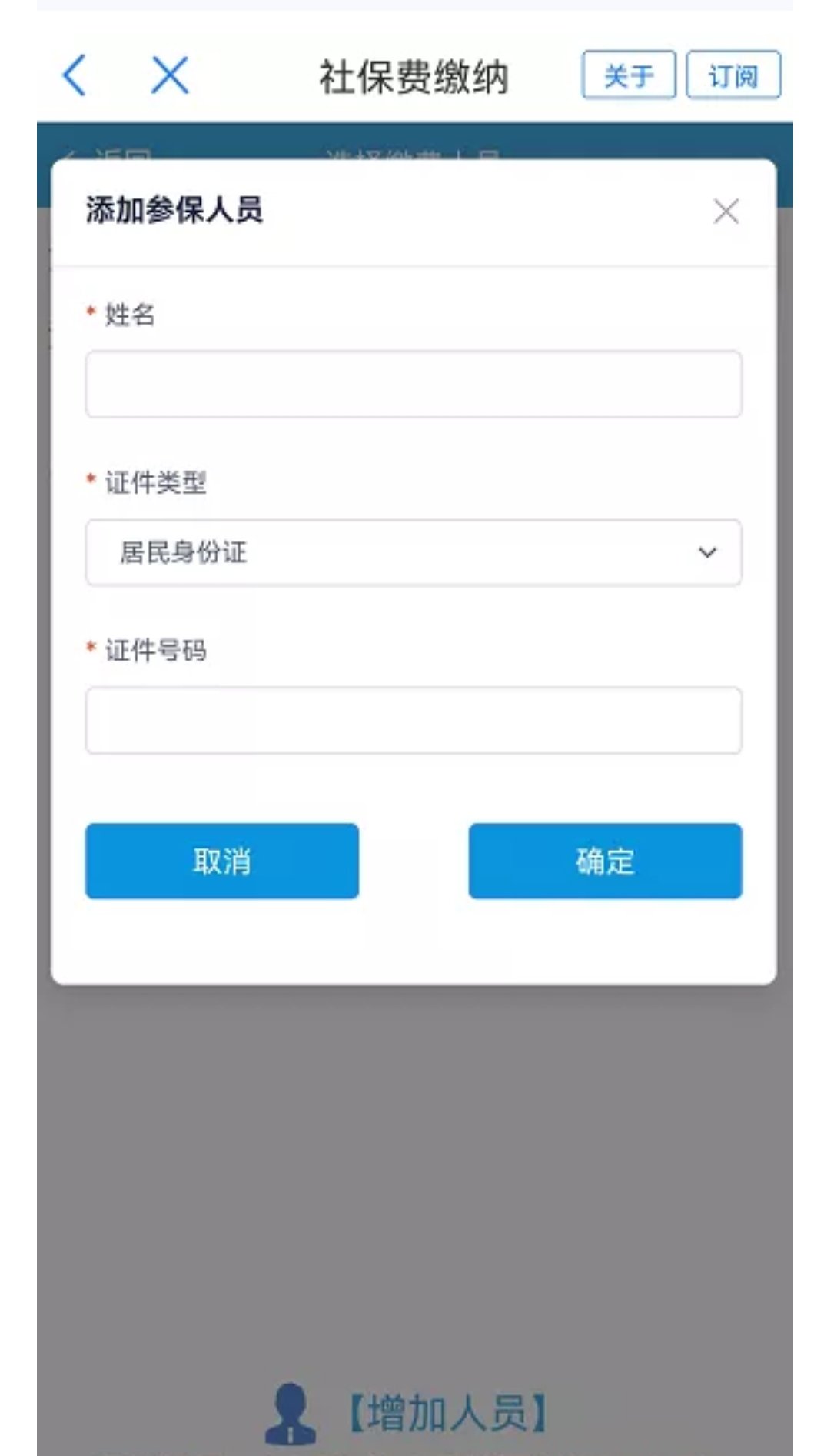 七、输入缴纳人员的姓名、证件号码,输入完成之后点击确定,如需为多个缴纳人员进行缴费,继续点击“增加人员”