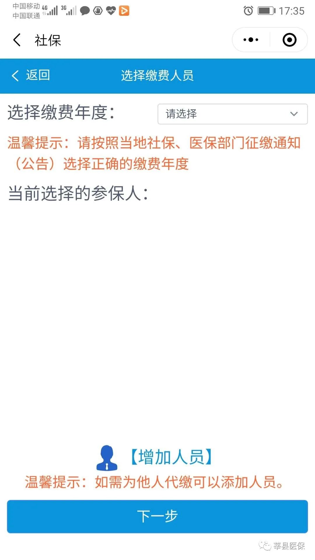 4、点击进入居民医保,“增加人员”信息,输入在校生基本信息,选择缴费年度为2022年。