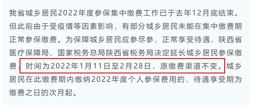 2022年度咸阳市城乡居民参保个人集中缴费时间为2021年10月20日至延长至2022年2月28日截止。