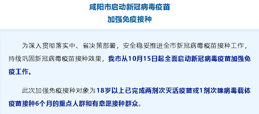为深入贯彻落实中、省决策部署,安全稳妥推进全市新冠病毒疫苗接种工作,持续巩固新冠病毒疫苗接种效果,咸阳市从10月15日起全面启动新冠病毒疫苗加强免疫工作。