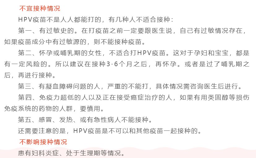 第二、怀孕或哺乳期的女性,不适合打HPV疫苗。这对于孕妇和宝宝,都是有一定风险的。所以建议在接种3-6个月之后,再怀孕。或者是过了哺乳期之后,再进行接种。