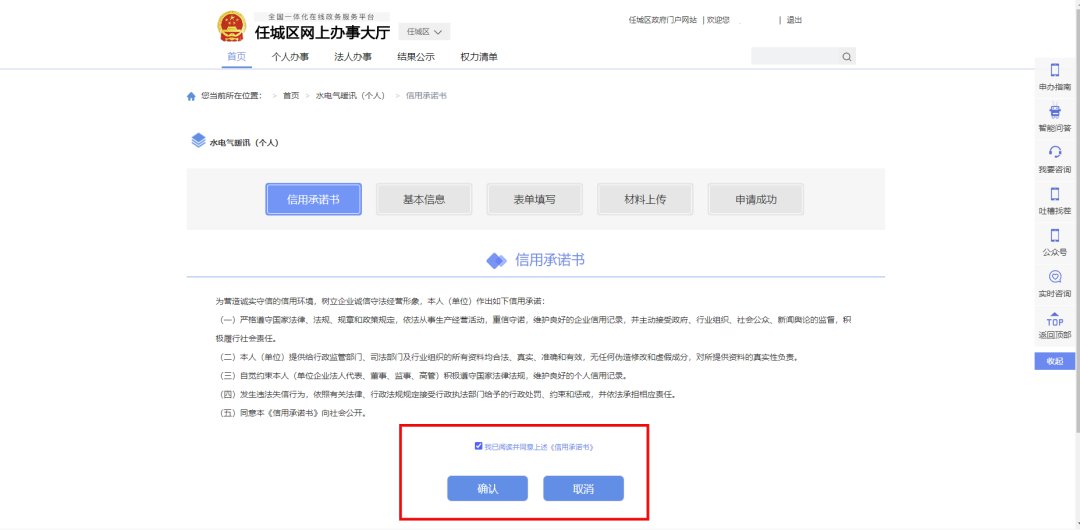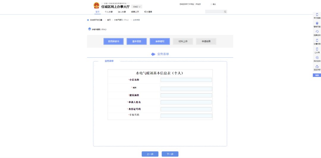 在表单填写处写清要报装的水电气暖讯基本信息,材料上传后,等候申请结果。
