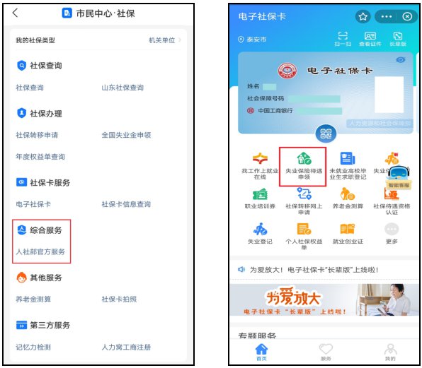 第二步,在“市民中心·社保”界面中,选择“综合服务-人社部官方服务”,进入到“电子社保卡”,选择“失业保险待遇申领”;