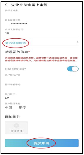 第四步,正确填写参保地(请选择最后一次失业保险参保地)、手机号码、核对社保卡银行账户,提交申请,等待审核并可查看审核结果。