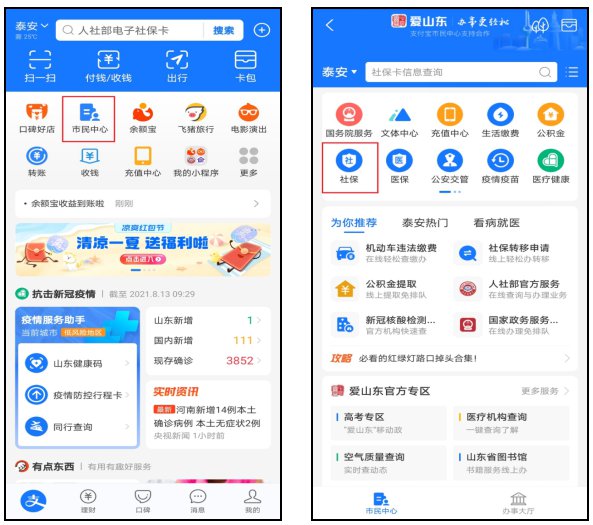 第一步,打开手机“支付宝”APP,选择“市民中心”;进入“市民中心”,选择“社保”服务;