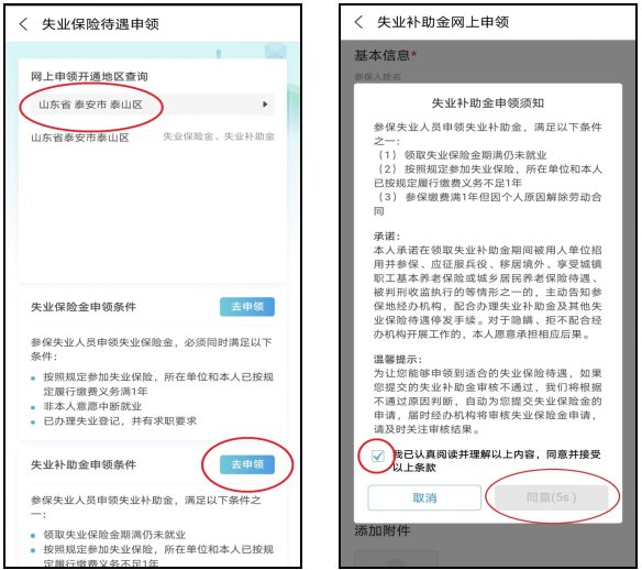 第三步,“网上申领开通地区查询”中可查询已开通网上申领的地区、市、县,查看“失业补助金申领条件”,点击“去申领”;在申请须知中,勾选、点击同意;